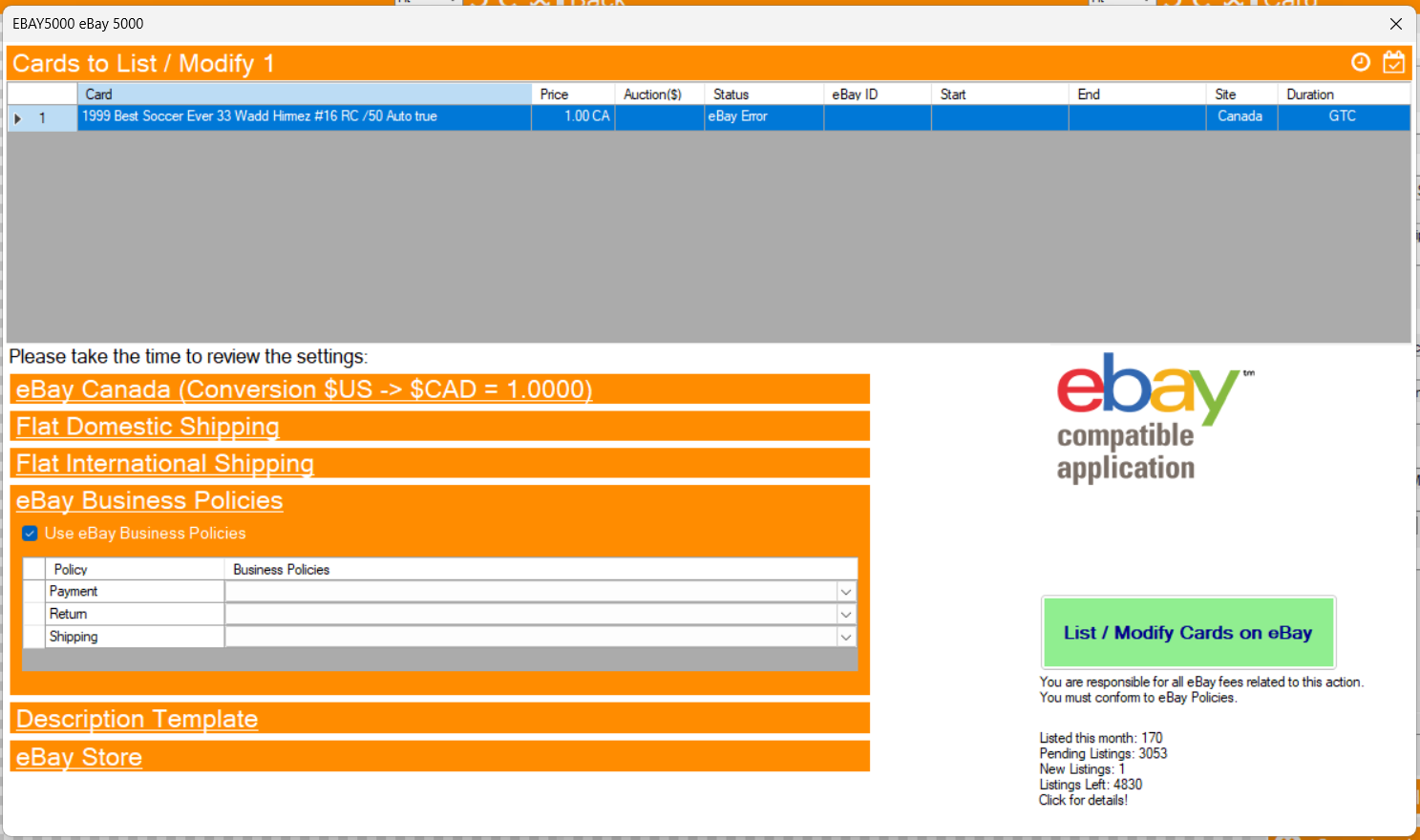 If you want to list new cards, you can now import your eBay business policies directly from eBay before listing. They can be selected from the eBay Busines Policies tab before listing: